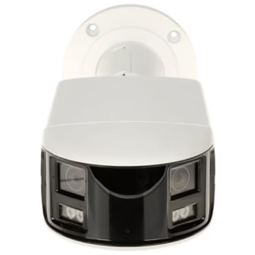 De DS-2CD2387G2P-LSU/SL panoramische camera van Hikvision heeft 2 4MP lenzen welke samen een 4K 180 graden beeld geven zonder dat de zijkanten een bol vertekenend beeld geven.
